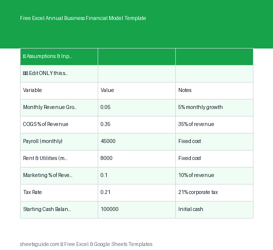 Download a free Excel template for annual business financial modeling with automated P&L, cash flow insights, and monthly projections.