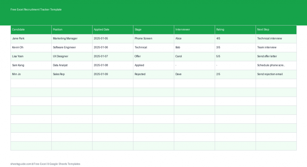 Download a free Excel template to track job applicants, interview stages, ratings, and hiring decisions. Works in Excel and Google Sheets.