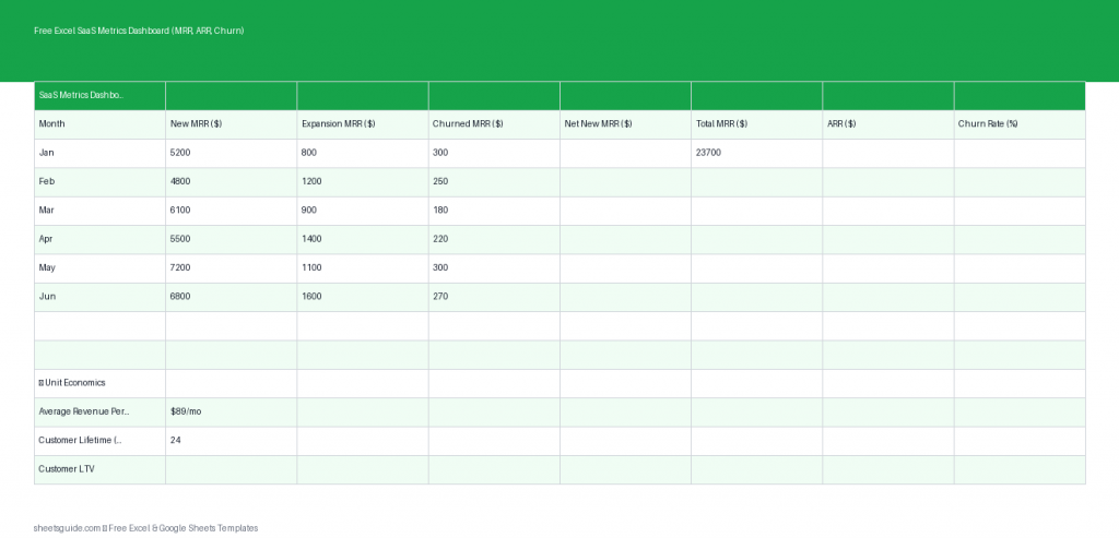 Download a free Excel template to track SaaS metrics like MRR, ARR, churn, LTV, and CAC with automated monthly calculations.
