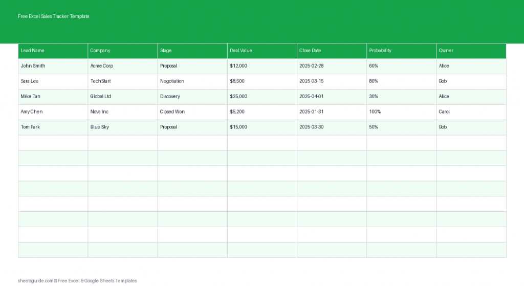 Download a free Excel sales tracker template to manage leads, deals, and revenue in a simple pipeline that also works in Google Sheets.
