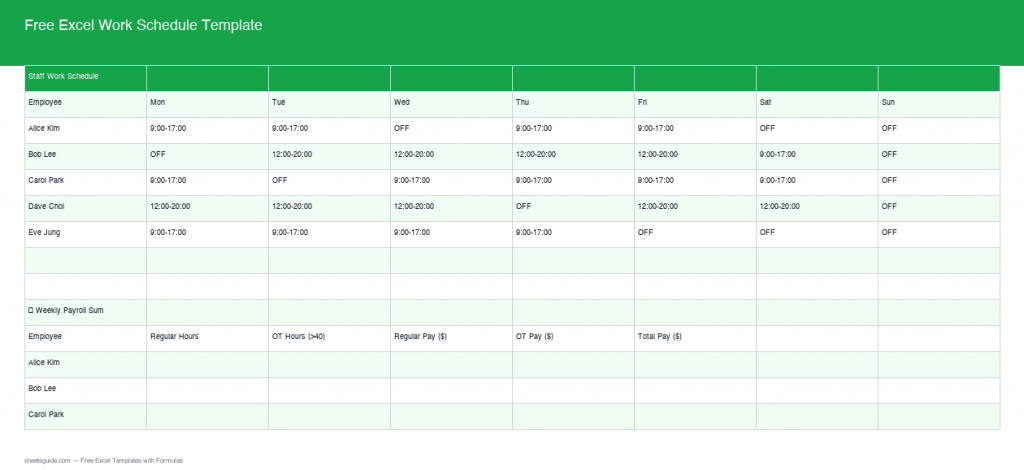 Streamline shifts and payroll with our Excel template featuring built-in formulas, weekly schedules, and payroll calculations.
