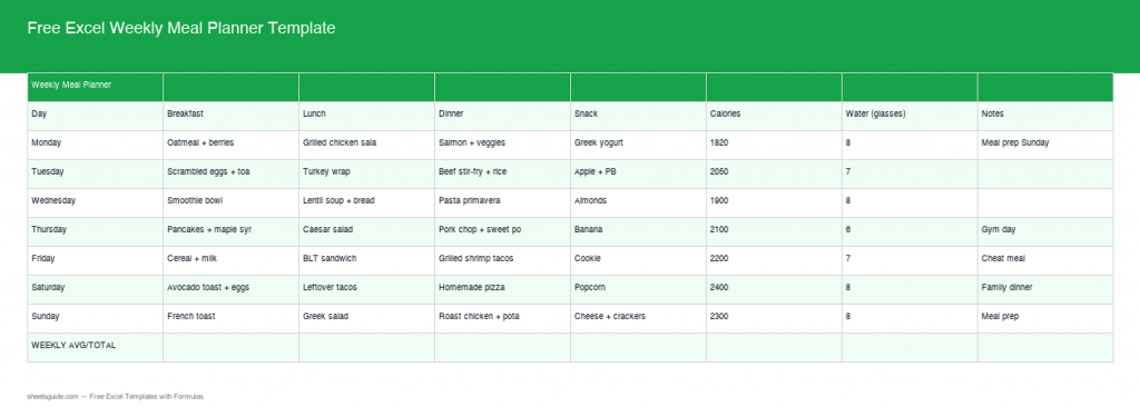 New Excel meal planner: auto-calculates calories, water intake, shopping list categories.