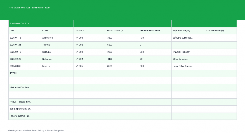 Usa esta plantilla de Excel para rastrear ingresos freelance, gastos e impuestos estimados con cálculos automáticos.