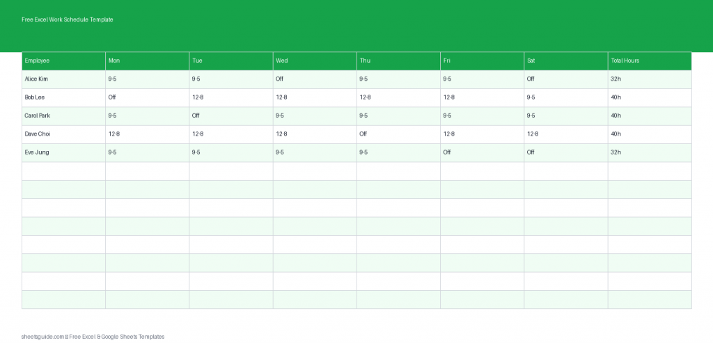 Descarga una plantilla gratuita de Excel para crear horarios semanales, asignar turnos y seguir las horas trabajadas. Compatible con Excel y Google Sheets.