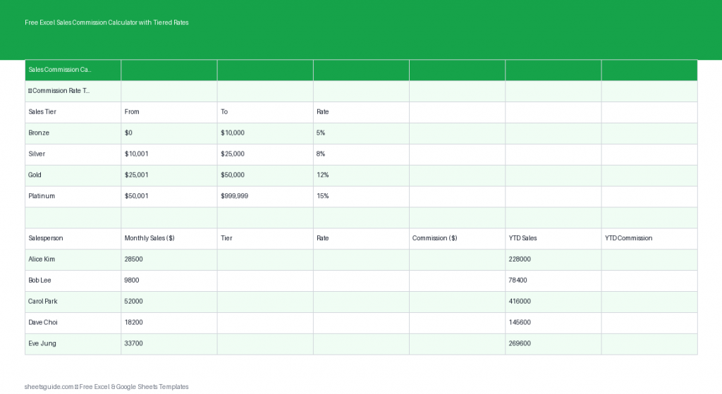 チームを管理する場合でも自分自身のコミッションを追跡する場合でも、このツールは信頼できる基盤を提供します。データを入力し、数式に仕事を任せ、重要なこと—売上と成長の推進に集中しましょう。